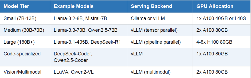 The compute layer is where the actual inference happens. On a Kubernetes private cluster with NVIDIA
