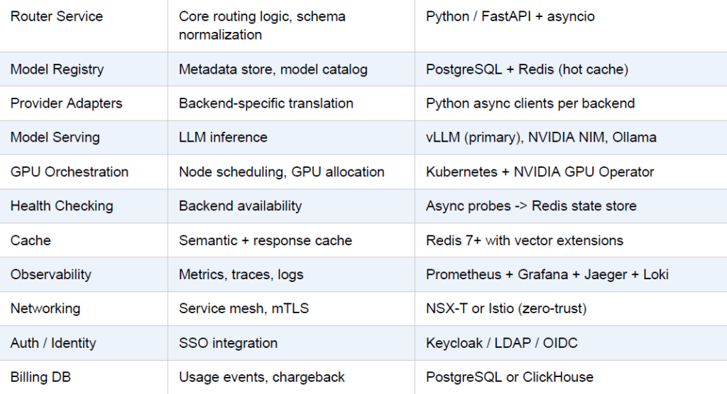 The private LLM router mirrors OpenRouter’s layered design but replaces every external dependency with