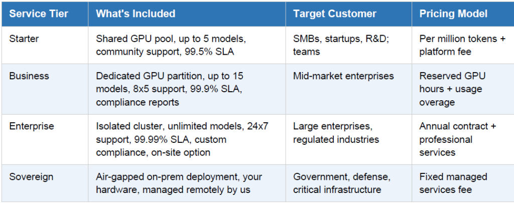 and continuously improving the routing layer so enterprises don’t have to build it themselves. This section outlines the business model, service tiers, orchestration use cases, and the multi-tenant architecture that makes it commercially viable.