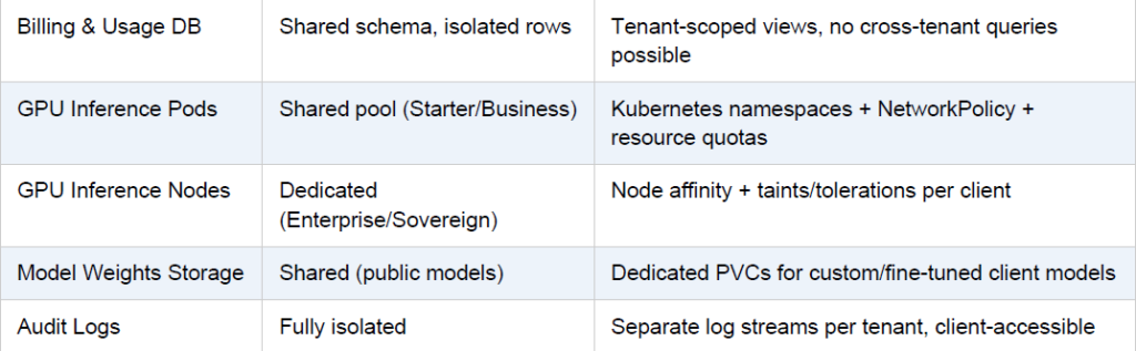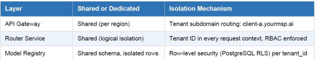 The key architectural challenge for a managed service is strong multi-tenant isolation while still sharing the expensive GPU compute efficiently. Here is how the layers split between shared and dedicated: