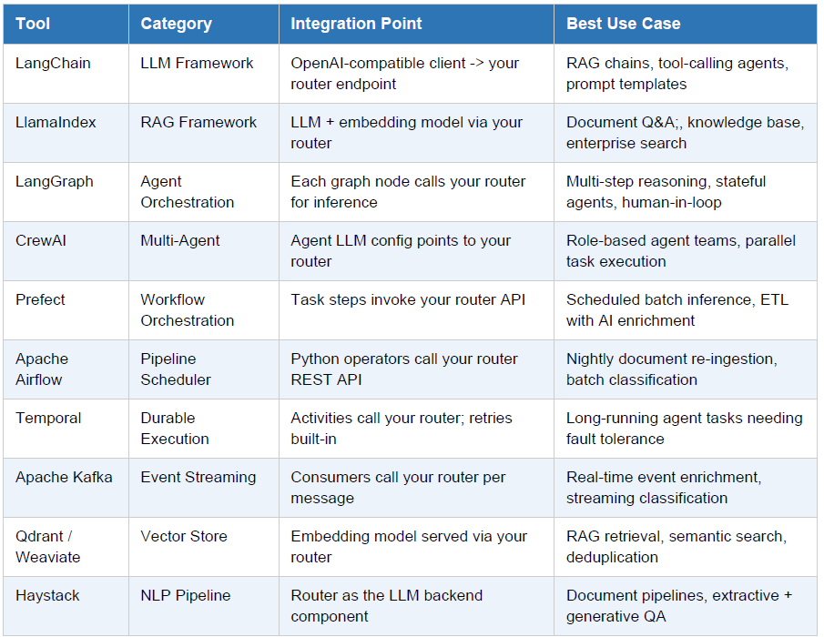 Below is a reference matrix of orchestration tools and how they integrate with your managed router