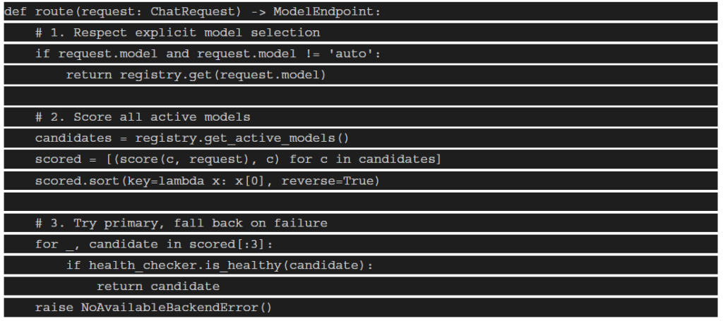 - Cost score: 1/cost_per_1k — prefer cheaper backends for simple tasks