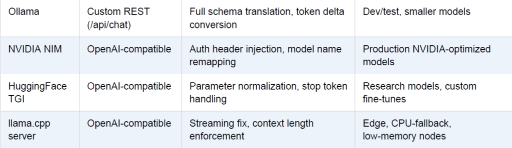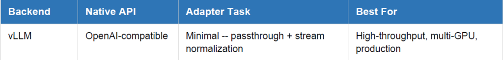 Each AI serving backend has a slightly different API contract. The adapter layer translates between your