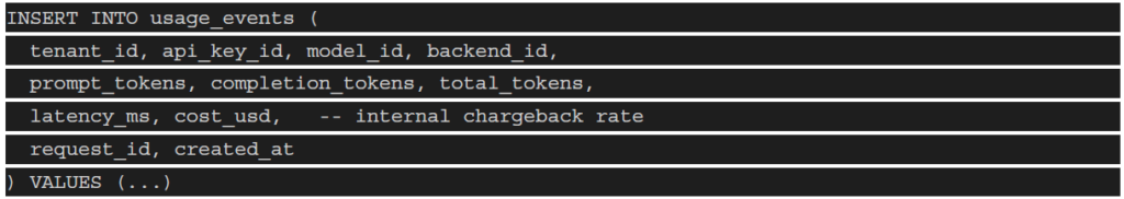 Usage event schema (write on every completed request):